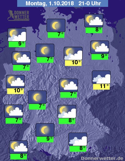 Am späten Abend ist es über der Westhälfte Deutschland locker bewölkt oder sternenklar, in der Osthälfte bleibt der Himmel meist wechselnd oder stark bewölkt. Schauer sind dabei aber nur selten zu erwarten.