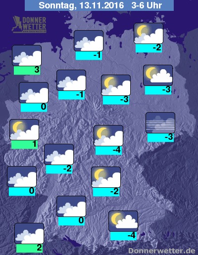 In der folgenden Nacht ist es zunächst noch verbreitet locker oder aufgelockert bewölkt, nach Osten und Nordosten hin auch oft sternenklar. Im Laufe der Nacht zieht sich der Himmel über der Westhälfte immer weiter zu, jedoch bleibt es im ganzen Land trocken. Die Temperatur sinkt auf 3 Grad an der Nordsee und bis -4 Grad im Thüringer Becken.