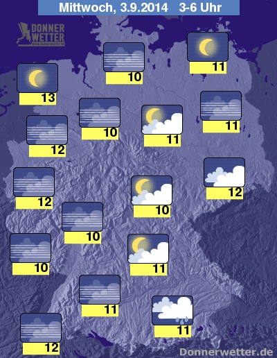 In der kommenden Nacht fällt, bei meist noch dichten Wolken, im Südosten des Landes noch zeitweise Regen, auch am Erzgebirge sind hier und da noch ein paar Tropfen möglich. Sowohl im Osten als auch in Süden ziehen immer wieder, zum Teil dichtere Wolken durch, diese bringen jedoch kaum Regen. In der Nordwesthälfte Deutschlands bleibt es bei verbreitet sternenklarem Himmel überall trocken. Nur stellenweise kann sich Nebel bilden. Die Temperaturen sinken auf 13 Grad in Ostfriesland und etwa 10 Grad im Westerwald.