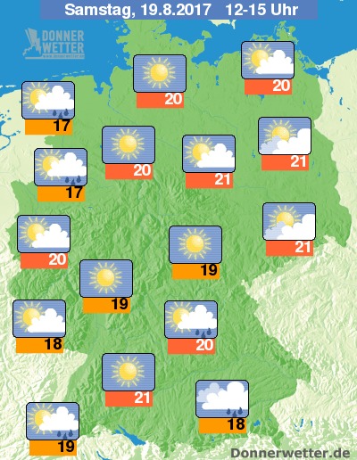 Heute Nachmittag bleibt es über dem Südosten des Landes noch weitgehend wolkenverhangen und regnerisch, sonst scheint jedoch verbreitet die Sonne von einem teils locker bewölktem, teils auch wolkenlosen Himmel. Am Oberrhein sowie am Niederrhein und dem Emsland ziehen gebietsweise dichte Wolken mit einzelnen Schauern auf, sonst bleibt es zunächst trocken. Die Temperatur liegt bei 17 Grad an der Ems und bis 21 Grad in der Lausitz.