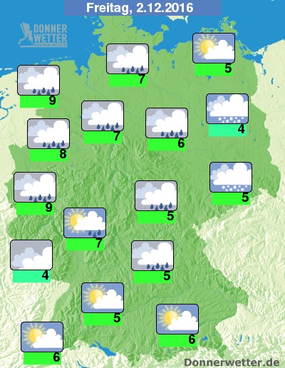 Das erste Türchen des Adventskalenders öffnen wir am Donnerstag dann bei meist starker Bewölkung, am freundlichsten bleibt es im Tagesverlauf im äußersten Süden. In der Nordhälfte muss immer wieder mit Regen gerechnet werden. Die Temperaturen erreichen Höchstwerte um 3 Grad C in Franken und um 10 Grad C im Emsland.