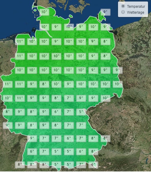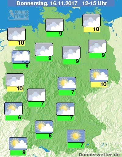 Die Höchstwerte zeigen dabei ein deutliches Nord-Süd-Gefälle. Am Alpenrand und im Allgäu übersteigt das Thermometer kaum die 5 Grad Marke, während am Niederrhein sowie im Norden und Osten des Landes 10 Grad und mehr möglich sind.