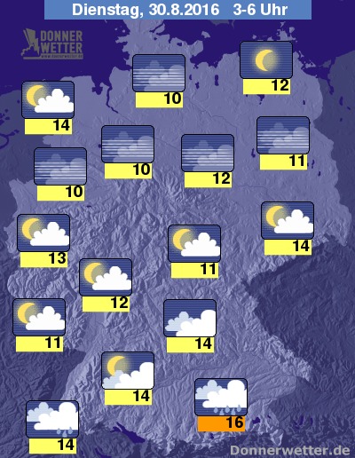 In der kommenden Nacht halten sich über dem Süden Deutschlands meist dichte Wolken und am Alpenrand fällt auch zeitweise Regen, sonst ist es weitgehend trocken. Im übrigen Bundesgebiet ist der Himmel dagegen meist nur locker bewölkt und vor allem im Norden auch meist sternenklar, dazu bleibt es trocken. Die Temperatur sinkt auf 16 Grad in München und bis 10 Grad am Niederrhein.