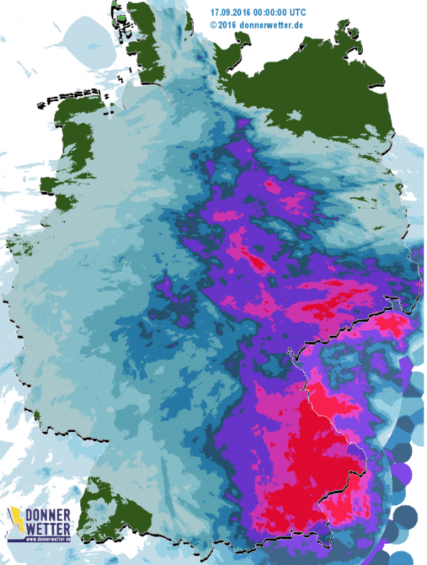 Nass war es in Deutschland, besonders in Sachsen und am Alpenrand. Teilweise fielen bis zu 50 l/m2. Trocken war es an der Nord- und Ostsee. Die Regenradarkarte zeigt schön die Verteilung des Regens von gestern: