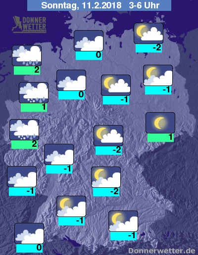 In der folgenden Nacht zeigt sich im Osten der Himmel noch oft sternenklar oder nur locker bewölkt, ansonsten ziehen jedoch überwiegend dichte Wolken durch, dabei bleibt es aber größtenteils trocken. Im Emsland fällt jedoch gebietsweise Schnee oder Schneeregen. Die Temperatur sinkt auf 2 Grad an der Ems und bis -2 Grad im Thüringer Becken.