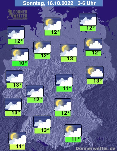 In der bevorstehenden Nacht ist der Himmel im Süden häufig gering bis wechselnd, sonst dagegen verbreitet stark bewölkt. Es bleibt weitgehend trocken, jedoch können dichte Wolken im Westen zum Morgen hin hier und da Regen bringen. Stellenweise bildet sich Nebel. Die Temperatur sinkt auf 14 Grad im Breisgau und 10 Grad im Münsterland. An der Nordsee weht ein teils stürmischer Wind.
