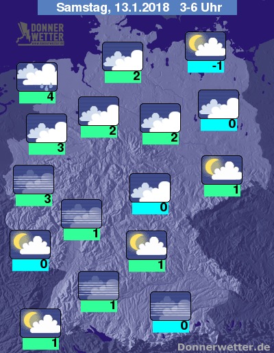 Am Samstag hält sich zum Teil starke Bewölkung, vielerorts kann sich im Tagesverlauf aber auch die Sonne durchsetzen, gebietsweise wird es sogar sonnig. Es bleibt trocken bei Werten zwischen 1 Grad an der Ostsee und bis 7 Grad im Oberrheingraben.