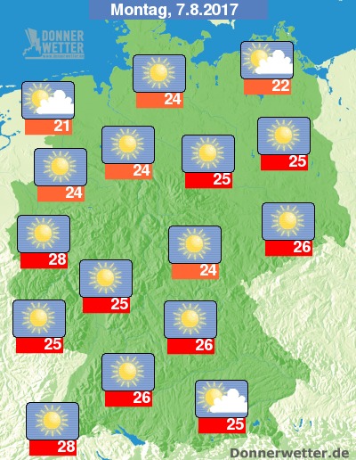 Zum Start in die Woche zeigt sich das Land überwiegend sonnig und auch sonst nur locker bewölkt, dazu bleibt es überall trocken. Die Temperatur erreicht etwa 21 Grad an der Nordsee und bis 28 Grad im Breisgau.