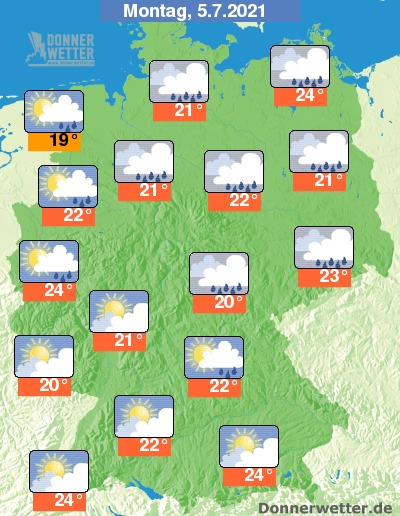 Am Montag zeigt sich das Wetter häufig stark, zum Teil aber auch aufgelockert bewölkt, dabei bilden sich gebietsweise Schauer, selten auch Gewitter. Im Tagesverlauf klingen die Niederschläge von Südwesten her nach und nach ab. Die Temperatur steigt auf 19 Grad in Cuxhaven und bis 24 Grad in München.