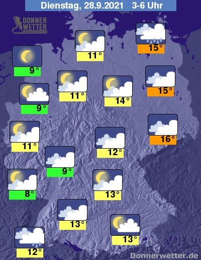 In der Nacht zum Dienstag bleibt es vor allem im Osten und Nordosten meist stark bewölkt und hier bilden sich einzelne Schauer, auch im Südwesten sind einzelne Schauer möglich. Im übrigen Land ist es teils stark, häufig aber auch wechselnd bis aufgelockert bewölkt, dazu bleibt es weitgehend trocken. Die Temperatur sinkt auf 16 Grad in Dresden und bis 8 Grad in Saarbrücken.