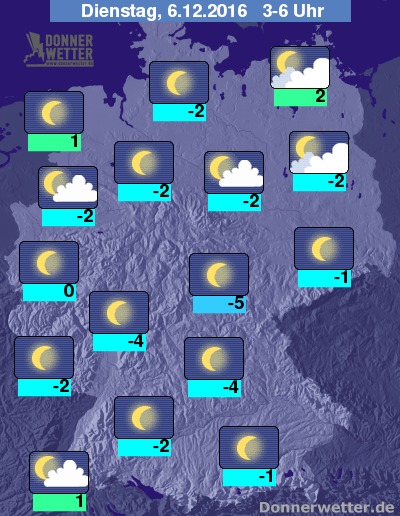 Heute Nacht funkeln über dem Land verbreitet die Sterne bei einem größtenteils wolkenlosen Himmel. Mehr Wolken ziehen jedoch über den Nordosten Deutschlands hinweg, dazu bleibt es trocken. Die Temperatur sinkt auf 2 Grad an der Ostsee und bis -5 Grad in Oberfranken.