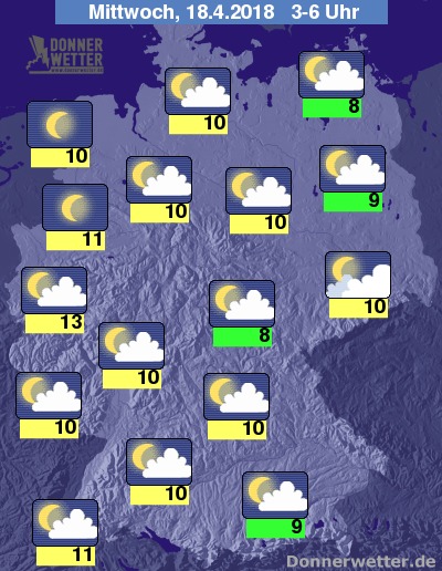 In der Nacht zum Mittwoch zeigt sich der Himmel wechselnd oder locker bewölkt, im Nordwesten ist es bereits zu Beginn verbreitet sternenklar, im weiteren Nachtverlauf klart der Himmel auch über dem Norden und Westen weitgehend auf. Es bleibt trocken bei Tiefstwerten von 13 Grad in Düsseldorf und etwa 8 Grad im Thüringer Becken.