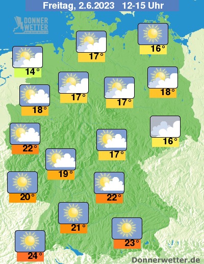 Heute Nachmittag ist es über der Republik überwiegend heiter oder sonnig. In einem breiten Streifen von West- bis nach Ostdeutschland hält sich allerdings auch gebietsweise starke Bewölkung, dabei bleibt es aber trocken. Die Temperatur liegt bei 14 Grad im nördlichen Emsland und 24 Grad im Oberrheingraben.