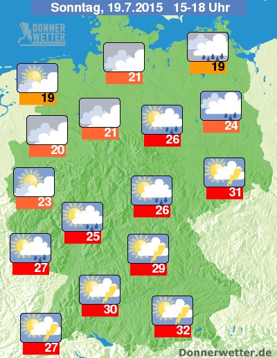 Heute Nachmittag zeigt sich hier und da die Sonne, häufig ziehen aber kompakte Wolken durch und es entwickeln sich zeitweise Schauer und teils kräftige Gewitter. Im äußersten Norden und Nordwesten fällt zeitweise Regen. Die Temperatur steigt auf 19 Grad an der Nordsee und bis auf schwülheiße 32 Grad in München.