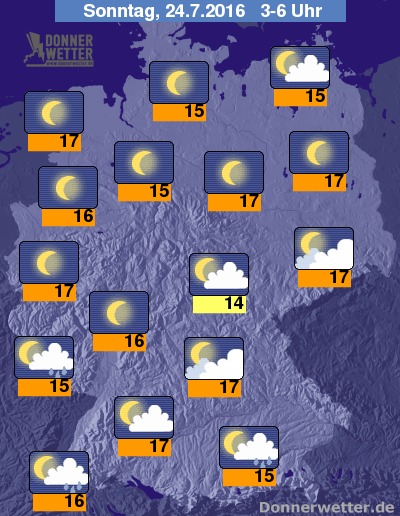In der Nacht zum Sonntag ist es vor allem im Süden noch meist stark, teils aufgelockert bewölkt und es bilden sich gebietsweise Schauer und lokale Gewitter. Über der Nordhälfte zeigt sich der Himmel größtenteils sternenklar und sonst locker bewölkt, hier bleibt es trocken. Die Temperatur sinkt auf 17 Grad in Berlin und 14 Grad im Thüringer Becken.