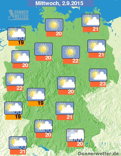 Heute halten sich im äußeren Süden noch meist dichte Wolken und es fällt häufiger oder zeitweiliger Regen. Im großen Rest des Landes zeigt sich hingegen verbreitet die Sonne und es ziehen meist nur lockere Wolkenfelder durch. Im Südwesten und im äußeren Westen und Nordwesten sind im Tagesverlauf jedoch vereinzelte Schauer möglich, sonst bleibt es hingegen trocken. Die Temperatur steigt auf 19 Grad im Saargau und auf etwa 23 Grad in Dresden.