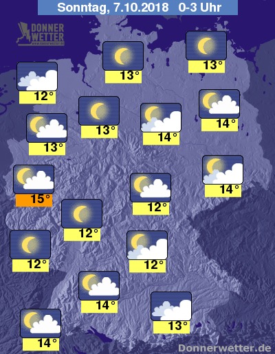Die Temperaturen liegen in der Nacht bei Werten um 15 Grad C im Rheinland und um 11 Grad C in den Mittelgebirgen.