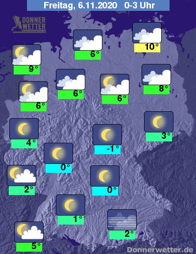 Bis zu den Frühstunden kühlt die Luft auf 7 bis -1 Grad ab, in Mittelgebirgstälern gibt es verbreitet leichten Frost und Reif. Am mildesten bleibt es mit Werten um 9 Grad direkt an der Nord- und Ostsee.