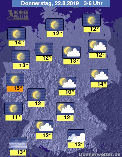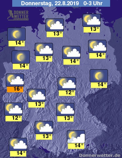In der Nacht zeigt sich der Himmel zunächst noch verbreitet locker bewölkt, im weiteren Verlauf klart es in der Nord- und Westhälfte des Landes auf. In den übrigen Landesteilen bleibt es bei harmlosen lockeren Wolkenfeldern.