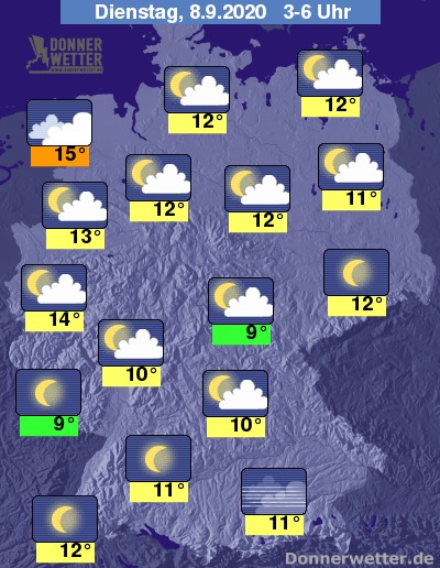 In der Nacht auf Dienstag zeigt sich der Himmel über weiten Landesteilen locker bewölkt, vor allem im Süden und über den südöstlichen Mittelgebirge funkeln die Sterne auch von einem wolkenlosen Himmel. In den frühen Morgenstunden verdichten sich die Wolken im Einzugsgebiet der Nordseeküste, es bleibt zunächst aber noch trocken.