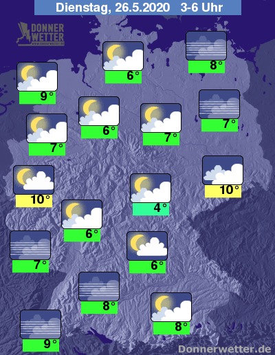 In der Nacht auf Dienstag ist der Himmel meist locker oder aufgelockert bewölkt, in der Westhälfte sowie im äußersten Nordosten kann sich im Verlauf auch stellenweise Nebel bilden. Bis auf einzelne Schauer im Südosten Deutschlands bleibt es in der Nacht trocken.