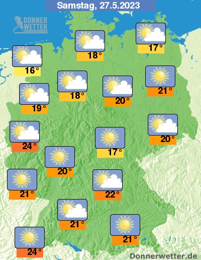Am Samstag bleibt es den Tag über verbreitet heiter oder sonnig, dabei bleibt es trocken. Die Temperatur erreicht kühle 16 Grad in Wilhelmshaven und bis 24 Grad in Bonn.