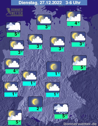 In der folgenden Nacht klingen die Schauer im Südosten nach und nach ab, sonst ist es schon verbreitet locker bewölkt und teils sternenklar und dazu trocken. Im Umfeld von Nord- und Ostsee ziehen jedoch wiederum dichte Wolken mit Schauern durch. Die Temperatur sinkt auf 5 Grad in München und 1 Grad in Saarbrücken. An der See weht ein starker und oft stürmischer Wind.