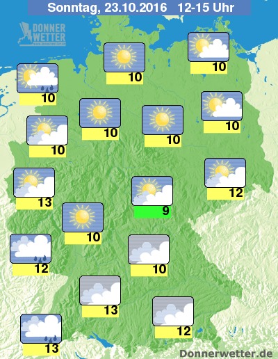 Heute Abend halten sich über dem Süden Deutschlands überwiegend dichte Wolken aus denen es zeitweise regnen kann. Von der breiten Mitte bis in den Norden scheint hingegen häufig die Sonne von einem teils wolkenlosen und sonst locker bis aufgelockert bewölktem Himmel. Die Werte liegen zwischen 10 und 13 Grad.
