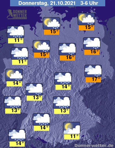 In der folgenden Nacht ziehen größtenteils dichte Wolken durch, dazwischen kann es auch mal etwas auflockern. Es bilden sich wiederholt, teils kräftige Schauer. Im Nordwesten sind zudem Gewitter möglich. Die Temperatur sinkt auf 17 Grad in Dresden und bis 11 Grad in Münster. Es weht ein starker, verbreitet auch stürmischer Wind. An den Küsten und auf den Bergen herrscht Sturm.