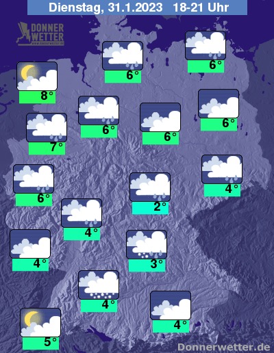 Heute Abend bleibt der Himmel weitgehend wolkenverhangen und es fällt im Süden zeitweise Schnee, Schneeregen oder Regen, sonst weitestgehend Regen und zum Teil auch Schneeregen. Die Temperatur liegt bei 2 Grad in Jena und bis 8 Grad in Cuxhaven. Über der Nordosthälfte weht ein oft stürmischer Wind. Auf den Bergen und an den Küsten herrscht teils schwerer Sturm.