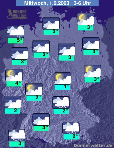 In der Nacht zum Mittwoch bleibt der Himmel stark bewölkt oder bedeckt. Schnee und Schneeregen ziehen sich zunächst auf den Süden zurück. Sonst bleibt es anfangs trocken, bevor etwa ab Mitternacht von Nordwesten her neuer Regen oder Schneeregen einsetzt. Die Temperatur sinkt auf 5 Grad in Bremerhaven und bis 1 Grad in Jena. Im Norden und Osten weht ein teils stürmischer Wind. An der See und auf den Bergen herrscht teilweise schwerer Sturm.
