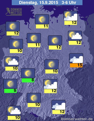 In der kommenden Nacht halten sich vor allem im Osten und Südosten oft dichte Wolken, aus denen aber nur selten etwas Regen fällt. Im übrigen Bundesgebiet zeigt sich der Himmel hingegen meist sternenklar, gebietsweise ist es aber auch locker bewölkt. Gegen Morgen ziehen im Westen und Nordwesten teils dichte Wolken auf, die vereinzelt Regen bringen können, sonst bleibt es aber trocken. Die Temperatur sinkt auf 15 Grad in Riesa und bis 8 Grad am Odenwald.
