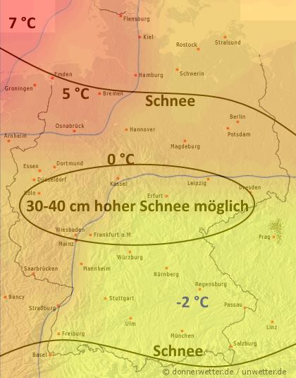 Bedingt durch die hohe Niederschlagsintensität sind bis zu 40 cm Neuschnee in höheren Lagen im Mittelgebirge und im Süden möglich. Zusammen mit starken Sturmböen werden Strommasten auf eine harte Probe gestellt.