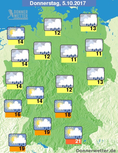 Am Donnerstag ist es im Süden zunächst noch verbreitet heiter und trocken, sonst ziehen bereits dichte Wolken übers Land, die immer wieder, teils auch kräftigen oder langanhaltenden Regen bringen. Nachmittags erreichen die Niederschläge auch den Süden des Landes während es von der Nordsee her häufiger auflockert, dabei sind dann einzelne Schauer möglich. Die Temperatur erreicht teils nur 11 Grad um Berlin und bis zu 21 Grad in München.