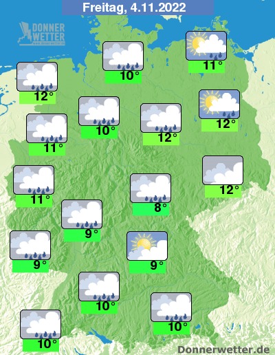 In der Nacht zum Freitag ziehen überwiegend dichte Wolken übers Land hinweg und es fällt vielerorts Regen bzw. es bilden sich einzelne Schauer. Auflockerungen sind eher selten bei Tiefstwerten von 10 Grad am Niederrhein und 7 Grad am Pfälzer Wald. Im Nordwesten und anfangs im Westen ist es noch oft stürmisch, an de Nordsee und in den nördlichen Mittelgebirgen herrscht häufig auch Sturm.