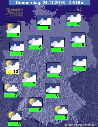 In der Nacht von Mittwoch auf Donnerstag sinken die Temperaturen auf 10 Grad C im Rheinland und 5 Grad C in Zwickau. Dazu bleibt es trocken und abwechselnd bewölkt und bedeckt. Im Südwesten kann man gebietsweise bei lockerer Bewölkung Sterne sehen.
