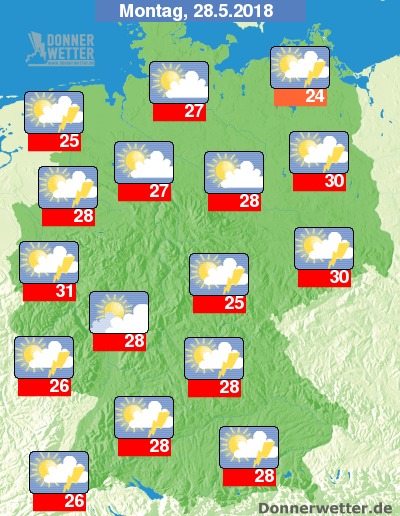 Am Montag ist es zunächst verbreitet heiter bis sonnig und trocken, im Südwesten sind jedoch bereits am Vormittag Schauer und örtliche Gewitter möglich. Im weiteren Tagesverlauf steigt auch das Gewitterrisiko über dem Süden und Westen. Im Norden und Osten bleiben Schauer und Gewitter seltener, hier scheint überwiegend die Sonne bei meist nur geringer Bewölkung. Die Temperatur steigt auf 24 Grad in Stralsund und bis 31 Grad in Köln.