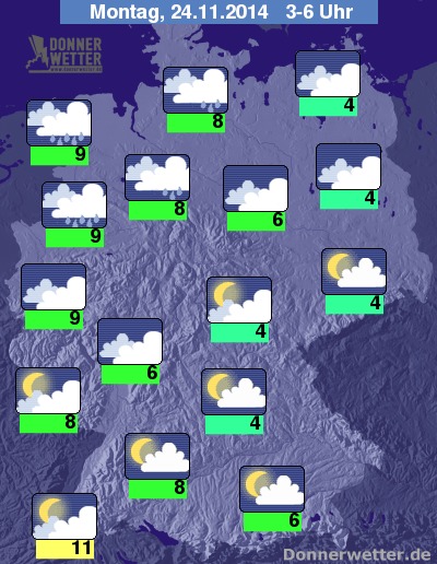 Am Montag ziehen die dichten Regenwolken vor allem über den Osten, Nordosten und die Mitte des Landes hinweg und bringen dabei zeitweise, zum Teil auch langanhaltenden Regen, im Süden bleibt es bei überwiegend aufgelockerter, teils aber auch starker Bewölkung weitgehend trocken. Verbreitet heiter und später auch häufig sonnig wird es im Nordwesten des Landes, auch im Westen zeigt sich am Nachmittag wieder häufiger die Sonne und es bleibt dann trocken. Die Temperatur steigt auf 8 Grad an der polnischen Grenze und auf bis zu 16 Grad am Alpenrand.