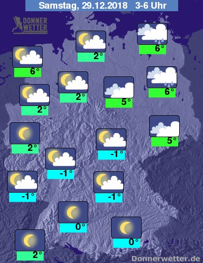 In der Mitte und im Süden bleibt es teils neblig-trübe, teils leuchten Mond und Sterne und die Luft kühlt häufig in den Frostbereich ab. Stellenweise muss mit Glätte durch überfrierende Nässe, oder Reifablagerungen gerechnet werden.