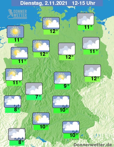 Heute Nachmittag bilden sich südlich des Mains unter kompakten Wolken gebietsweise Schauer. Meist dichte Bewölkung hält sich auch über der breiten Mitte des Landes und im Nordosten, dazu bleibt es aber weitgehend trocken. Häufiger Sonnenschein und trockenes Wetter herrscht über Niedersachsen und Schleswig-Holstein. Die Temperatur liegt bei 7 Grad am Westerwald und etwa 12 Grad in der Altmark.