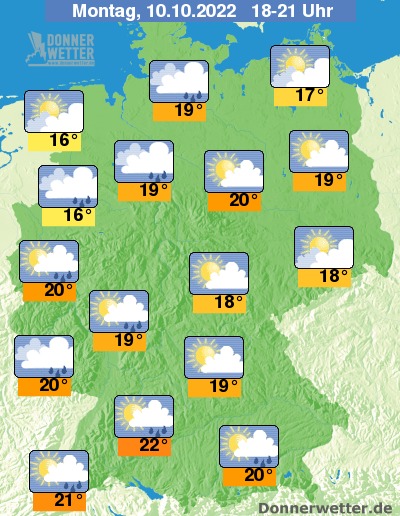 Heute Abend bleibt es nach Osten hin noch meist heiter und trocken, ansonsten ziehen von Nordwesten her jedoch verbreitet auch dichte Wolken durch, die gebietsweise zu Schauern führen. Die Temperatur liegt bei 16 Grad in Cuxhaven und bis 22 Grad in Stuttgart.