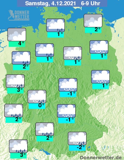Der Samstag startet trüb oder der Himmel ist bedeckt. Während es im Umfeld der Küsten zumeist trocken bleibt, muss in den übrigen Landesteilen verbreitet mit Schneeregen- oder Regenschauern gerechnert werden, vor allem in den östlichen und südöstlichen Mittelgebirgen Schnee. Weiterhin besteht vorrangig im Süden und Südwesten ein erhöhtes Glatteisrisiko durch gefrierenden Regen.