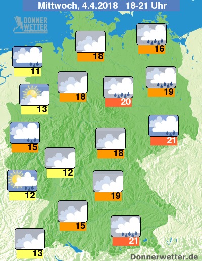 Heute Abend liegen dichte Regenwolken über den östlichen Landesteilen, dabei bilden sich hier teils kräftige Schauer und vereinzelt auch Gewitter. Im übrigen Bundesgebiet ist es häufig stark, hier und da aber auch aufgelockert bewölkt und zumeist trocken. Die Temperatur liegt bei 11 Grad in Cuxhaven und bis 21 Grad in München.