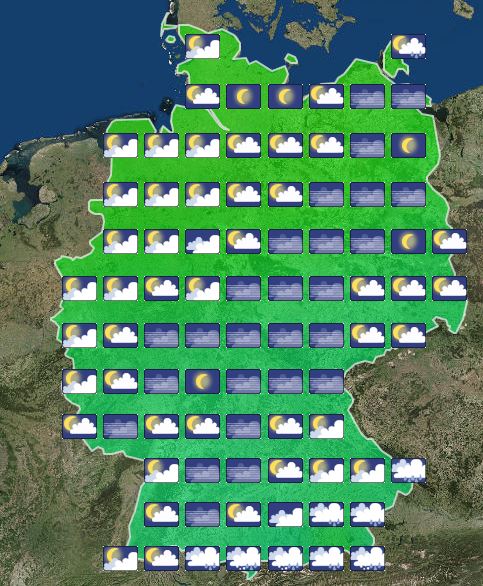 In der folgenden Nacht halten sich am Alpenrand und über Südbayern dichte Wolken aus denen zeitweise Regen fällt. In einem breiten Streifen vom Südwesten bis nach Nordostdeutschland zeigt sich der Himmel meist sternenklar, sonst ist es überwiegend wechselnd oder aufgelockert bewölkt, jedoch trocken. Die Temperatur sinkt auf 13 Grad in Stralsund und bis 4 Grad am Thüringer Wald.