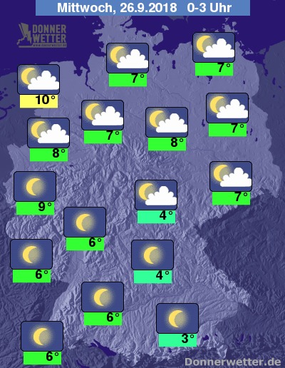Die Temperaturen sinken in der Nacht auf Werte um 10 Grad C in Ostfriesland und um 2 Grad C entlang der Alpen.