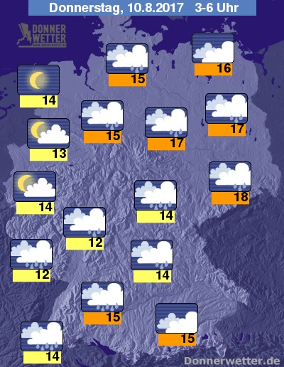 In der bevorstehenden Nacht bleibt es lediglich entlang des Niederrheins und der Ems meist locker bewölkt und dazu trocken, sonst ziehen von Süden her verbreitet dichte Wolken auf und es fällt zeitweise, zum Teil auch kräftiger und gewittriger Regen. Die Temperatur sinkt auf 18 Grad in Dresden und bis 12 Grad am Taunus.