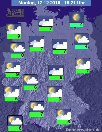Heute Abend lockert es über der Südwesthälfte verbreitet auf, oft ist es auch sternenklar. Im Nordosten ist es überwiegend sternenklar. Im übrigen Bundesgebiet halten sich dagegen meist dichte Wolken, dazu bleibt es jedoch ebenfalls trocken. Die Abendtemperatur liegt bei 4 bis 9 Grad.