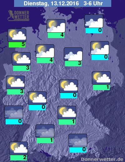 In der Nacht zum Dienstag ziehen über den Norden häufig dichte Wolken hinweg, die hier und da ein paar Tropfen bringen können. Der Süden zeigt sich stattdessen verbreitet sternenklar, hier kann sich jedoch auch gebietsweise Nebel ausbilden. In den übrigen Landesteilen ist es meist locker bis aufgelockert bewölkt und dazu trocken. Die Temperatur sinkt auf 5 Grad an der Ems und bis 0 Grad in München.