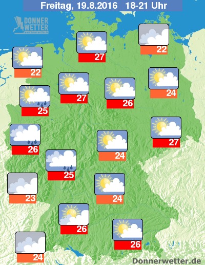 Heute Abend ist es vor allem über der deutschen Osthälfte noch überwiegend heiter und sonst wechselnd bewölkt und dazu trocken. Im Westen werden die Wolken hingegen immer dichter und es können sich Schauer bilden, auch im Südwesten ziehen dichte Wolken auf, dazu bleibt es aber mehrheitlich trocken. Im Nordwesten ist es meist noch wechselnd bis aufgelockert bewölkt und weitgehend trocken. Die Temperatur liegt bei 22 Grad in Rostock und um 27 Grad in Hannover.