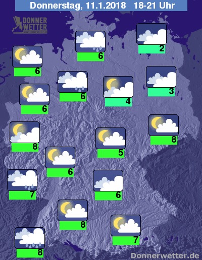 Im Lauf der Nacht zieht das Regengebiet im Norden weiter westwärts und erreicht bis zum Morgen die Nordseeküste. Dahinter ist der Himmel in der Nacht meist dicht bewölkt. In der Südhälfte zeigen sich hingegen größere Wolkenlücken, lediglich in Teilen Bayerns bilden sich am Morgen dichte Nebelfelder.